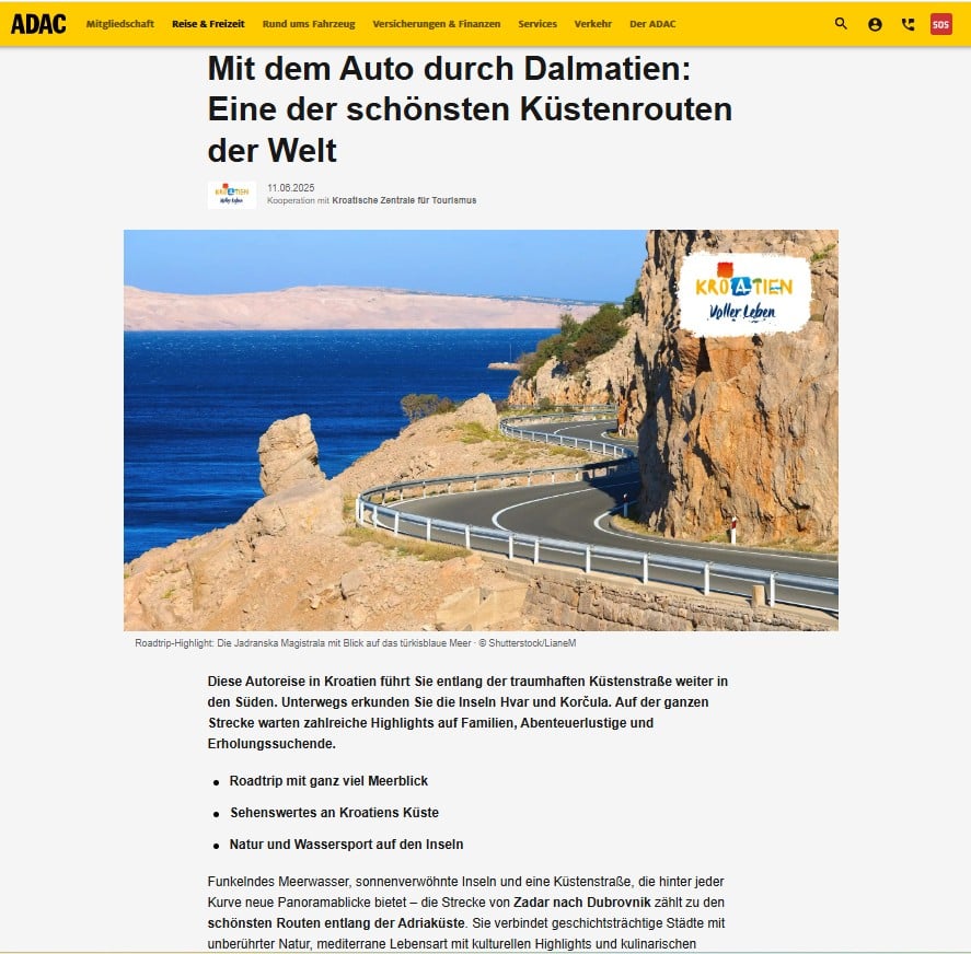 Hrvatska turistička zajednica nastavlja uspješnu suradnju s ADAC-om, najvećim njemačkim i europskim automobilskim klubom. Suradnja se odnosi na njemačko tržište te je usmjerena na promociju ljepota i raznolikosti hrvatskih destinacija, bogatstva kulturne i povijesne baštine te očuvanosti prirode, a sve s ciljem očuvanja pozicije Hrvatske kao jedne od najomiljenijih inozemnih destinacija njemačkih gostiju. Središnja tema ovogodišnje suradnje je „Roadtrip kroz Hrvatsku“, a riječ je o konceptu osmišljenom kako bi odgovorio na želje putnika za individualnim i fleksibilnim oblicima putovanja.