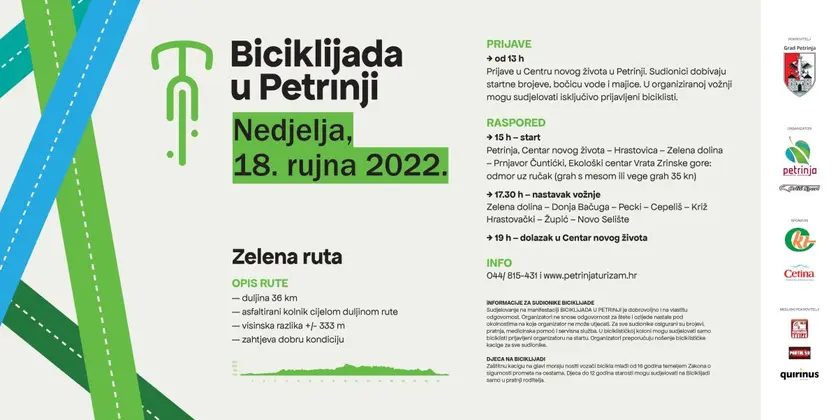 U Petrinji se u nedjelju 18. rujna 2022. održava Biciklijada. Organizatori, Turistička zajednica Grada Petrinje i Orlić Sport d.o.o., pozivaju sve na vožnju Zelenom rutom i uživanje u prekrasnoj prirodi petrinjskog kraja.