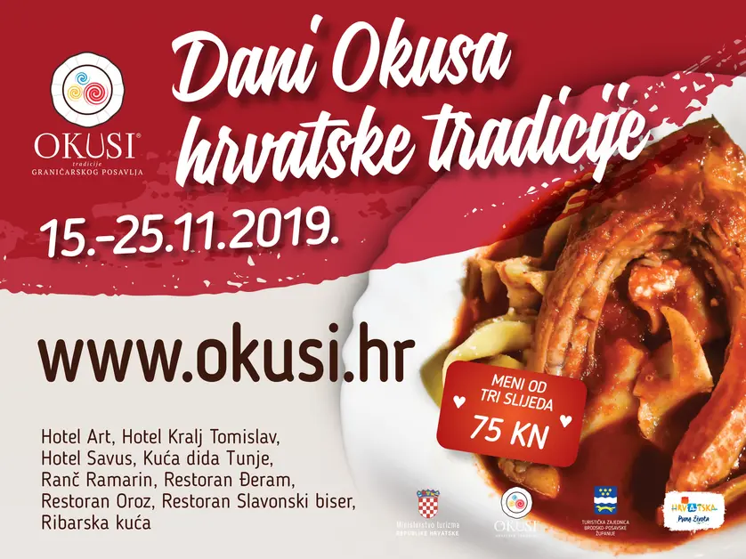 Zavirite u bogatu paletu hrvatskog gastronomskog blaga i za samo 75,00 kn uživajte u slijedu od tri tradicijska jela čija se priprema, u objektima nosiocima standarda Okusi graničarskog posavlja u Brodsko – posavskoj županiji , s ljubavlju njeguje i danas. Jela su to čiji  mirisi i okusi osvajaju dušu i tijelo, a blagovanje pretvaraju u istinski doživljaj i užitak.