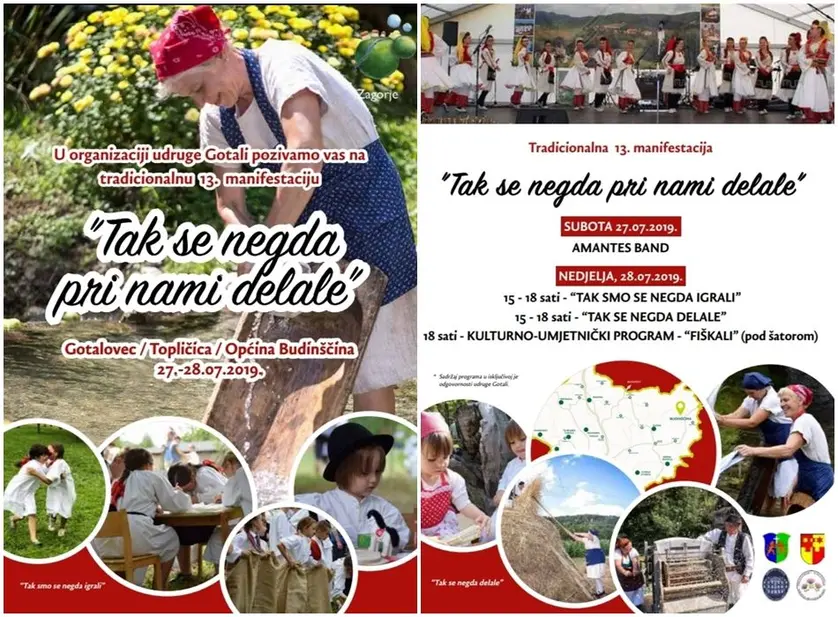 Tradicionalna 12. po redu manifestacija „Tak se negda pri nami delale“, sklop je trodnevnih događanja uz prikaz starih običaja i težačkih poslova poput izrada bačvi, predenja na kolovratu, mljevenja na starome mlinu (vodenici), ručnog mljevenja kukuruza, izrade košara, glačanja na žar, kao i tradicijskih igara, kulturno-umjetničkih programa i zabave.