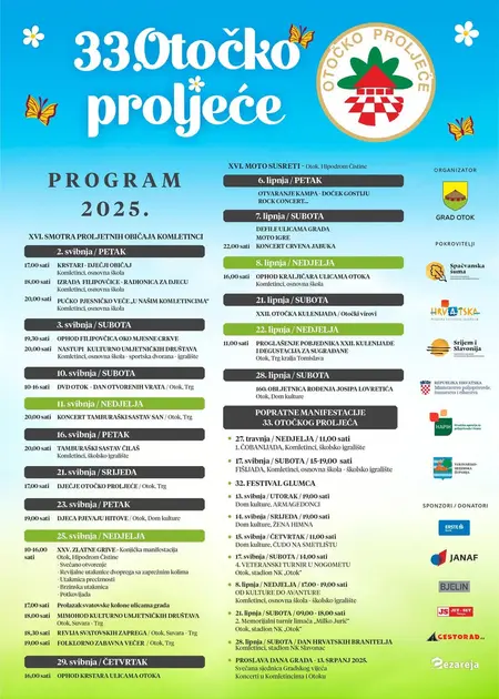 Bogati i raznovrsni program manifestacije odvijat će se tijekom svibnja i lipnja 2025. godine u gradu Otoku i naselju Komletinci. Program započinje Smotrom proljetnih običaja Komletinčinih, dječjim radionicama, pjesničkim večerima i nastupima kulturno-umjetničkih društava. Posebno se ističu koncerti tamburaških sastava, dječje priredbe te tradicionalni ophodi i povorke kroz ulice grada. U sklopu manifestacije održavaju se i popularni Moto susreti, natjecanja u kuhanju fiš paprikaša, festival glumca te brojne druge popratne aktivnosti. Vrhunac programa čine XXII. Otočka kulenijada i obilježavanje značajnih obljetnica, a sve završava velikom proslavom Dana grada 3. srpnja. Otočko proljeće i ove godine okuplja brojne sudionike i posjetitelje, čuvajući bogatu tradiciju i običaje ovoga kraja.