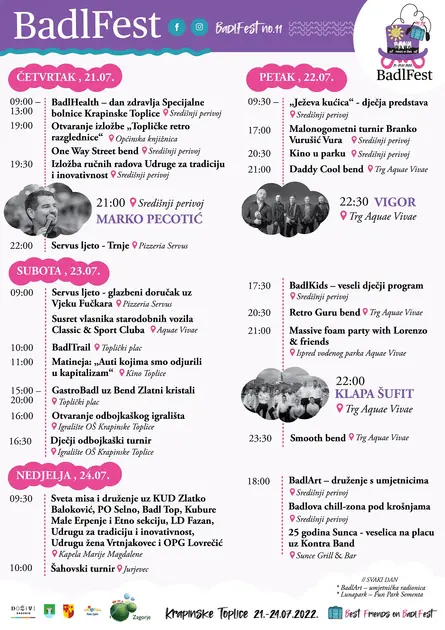 Kroz četiri dana posjetitelje čeka raznovrstan program: BadlFun - 11 koncerata za 11 godina festivala, veseli dječji BadlKids program, BadlSport s trailom, starodobnim vozilima, šahovskim, malonogometnim i odbojkaškim turnirom te školu ronjenja. Na GastroBadlu u organizaciji Udruženja obrtnika Krapinske Toplice svoje će kuhače ukrstiti preko 100 sudionika, a sve će imati posebnu humanitarnu notu.