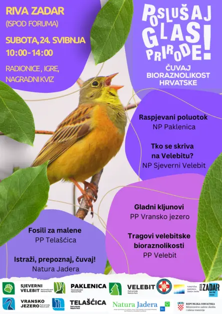 Manifestacija „Poslušaj glas prirode“ koja se organizira povodom obilježavanja Međunarodnog dana bioraznolikosti i Dana zaštite prirode u RH održat će se na Rivi u Zadru (ispod Foruma) u subotu 24. svibnja 2025. od 10:00 do 14:00 sati. Ovo je događanje rezultat suradnje više javnih ustanova za upravljanje zaštićenim područjima i područjima ekološke mreže, koje svojim zajedničkim djelovanjem žele naglasiti važnost očuvanja bioraznolikosti te potaknuti svijest o zaštiti prirode, posebno kod najmlađih.