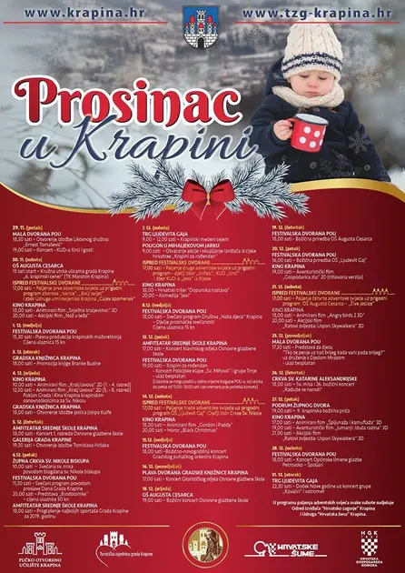 U četiri tjedna došašća na trgu Ljudevita Gaja gradske udruge, škole i institucije pripremaju prigodni program „Prosinac u Krapini“ u sklopu kojeg se pale i adventske svijeće. Na ostalim lokacijama u gradu priređuju se prigodni koncerti, radionice, a sve završava programom dočeka Nove godine uz atraktivan vatromet.