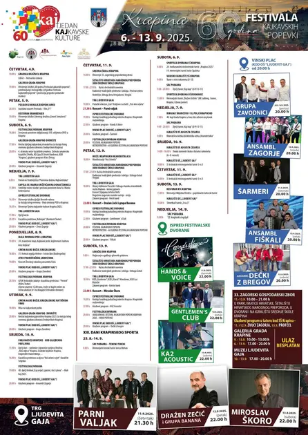 Posjetitelji će uživati u nastupima domaćih glazbenih sastava, kazališnim predstavama, dječjem korzu s 15 grupa iz Zagorja te koncertima Parnog Valjka, Dražena Zečića i Miroslava Škore. U bogatoj ponudi ističu se i gastro i vinski placevi s eminentnim zagorskim vinarima te tematske suvenirske kućice izrađene povodom jubileja. Program obuhvaća prezentacije manifestacija iz cijelog kajkavskog područja, oldtimer konvoj pjevača i brojne inovativne sadržaje i instalacije po gradu. Raspored događanja uključuje i druženja u franjevačkom samostanu, mapu parkirnih mjesta te četiri festivalske pozornice s raznovrsnim večernjim sadržajem