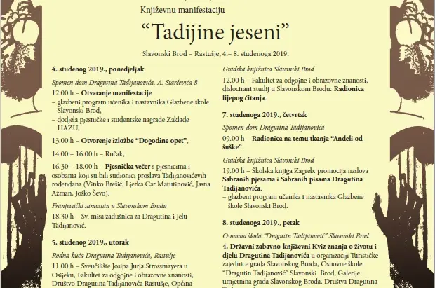 U Slavonskom Brodu i Rastušju, od 4. do 8. studenog održava se književna manifestacija, "Tadijine jeseni".