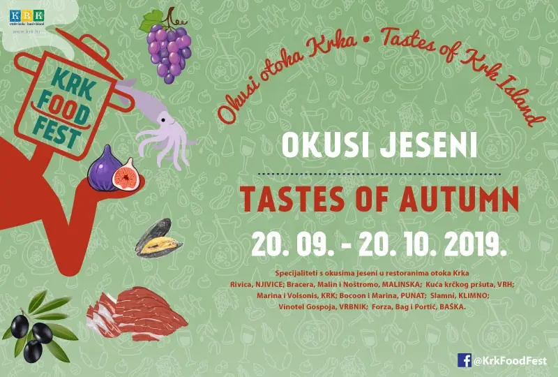 Na otoku Krku se od 20. rujna do 20. listopada u 14 restorana održava manifestacija Krk Food Fest: Okusi jeseni. Ako se tijekom jeseni nađete na Krku, imat ćete prilike probati i namirnice koje su u to doba najbolje te su inspiracija kreativnosti krčkih restoratera - lignje, vrganji, masline, grožđe, smokve, kesteni, bundeve, kruške i jabuke, pripremaju se uz ostale krčke specijalitete u slatkim i slanim varijantama.
