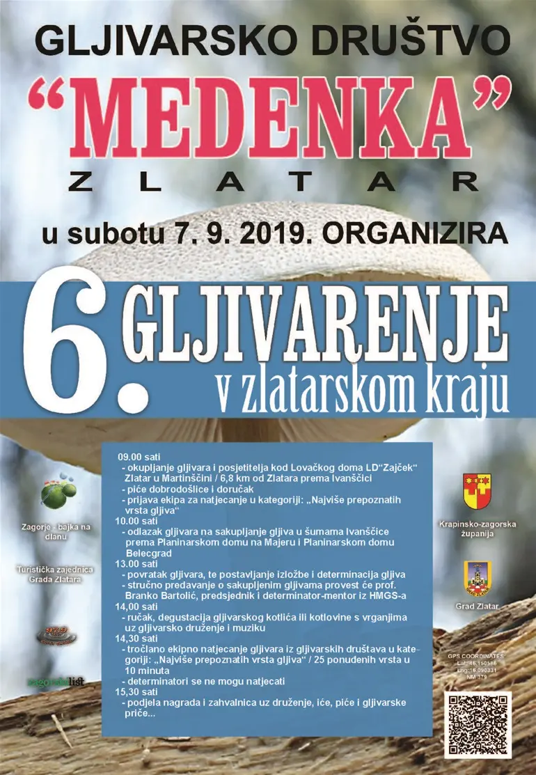 Sudionici će naučiti ponešto o vrstama gljiva, njihovom sortiranju, pripremanju i konzerviranju te dobiti priliku degustirati gljivarski kotlić uz ugodno druženje u prirodi s Gljivarskim društvom Medenka iz Zlatara.