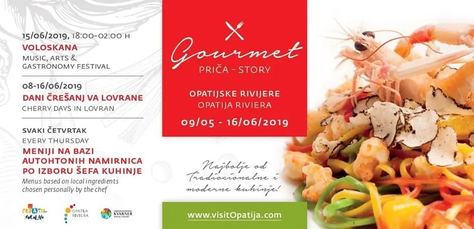 Od 9. svibnja pa do 16. lipnja, u 28 restorana i konoba s područja Opatije, Lovrana, Mošćeničke Drage i Ičića svaki četvrtak nudit će se posebno osmišljeni meniji na bazi autohtonih namirnica po izboru šefa kuhinje. Početkom lipnja, manifestaciji se priključuje poznato gastro događanje „Dani črešanj va Lovrane“, a finale Gourmet priče odvija se u Volosku, gdje se održava Music, arts & gastronomy festival u subotu, 15. lipnja od 18 sati.