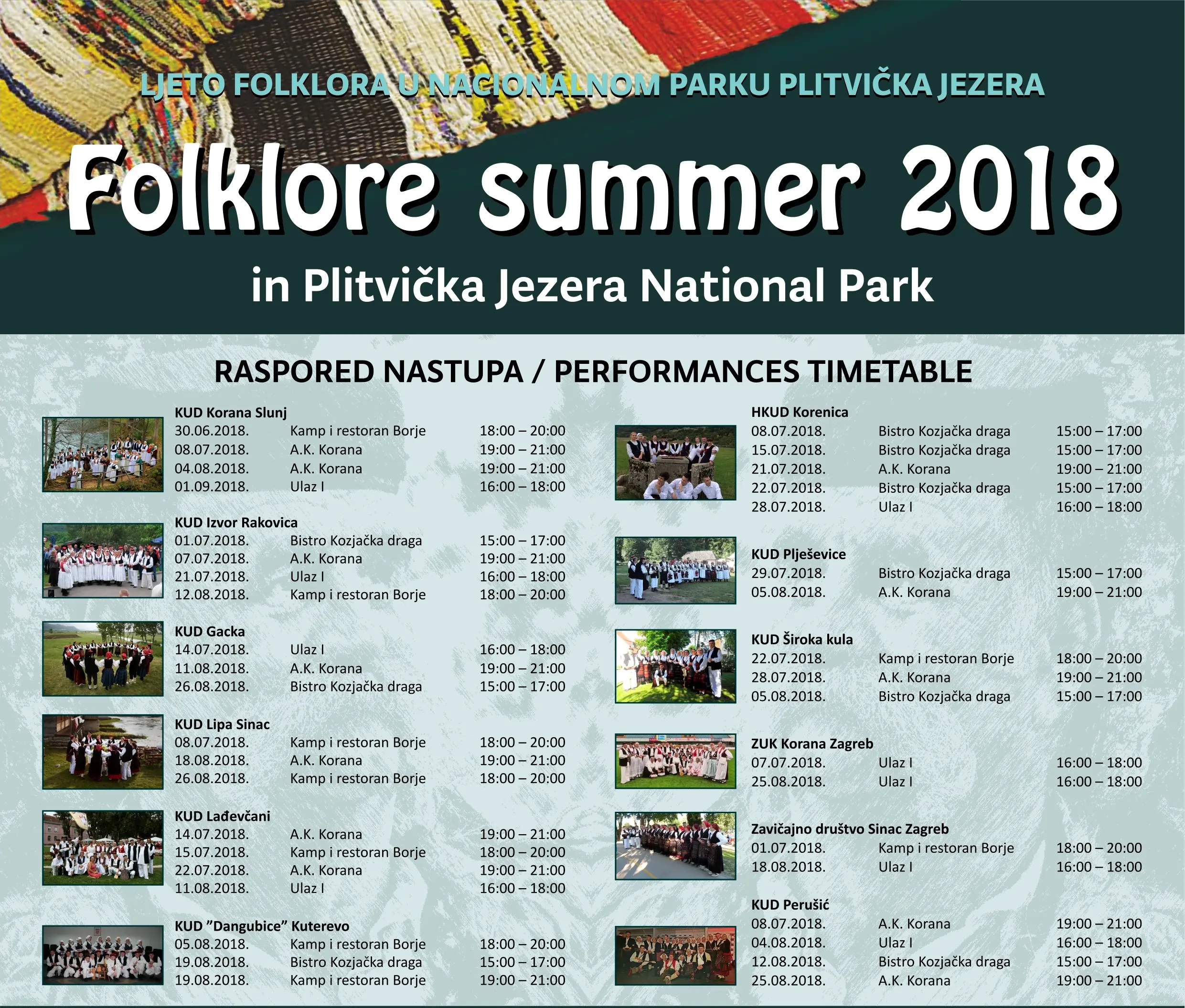 Folklorno ljeto u Nacionalnom parku Plitvička jezera već je počelo, traje sve do 26. kolovoza, a posjetiteljima donosi mnogobrojne nastupe KUD-ova ovog kraja. Folklorna društva nastupat će na više lokacija u parku.