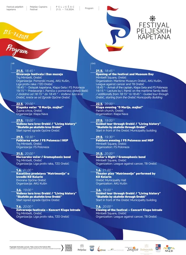 U tijeku je i Offshore Challenge Orebić 2024 – lov na veliku ribu (15.5. – 18.5.). Na posljednji dan manifestacije, 18. svibnja na Lučici u Orebiću uz proglašenje pobjednika, očekuje vas velika fešta, riba i vino o trošku organizatora i koncert popularnog Joleta